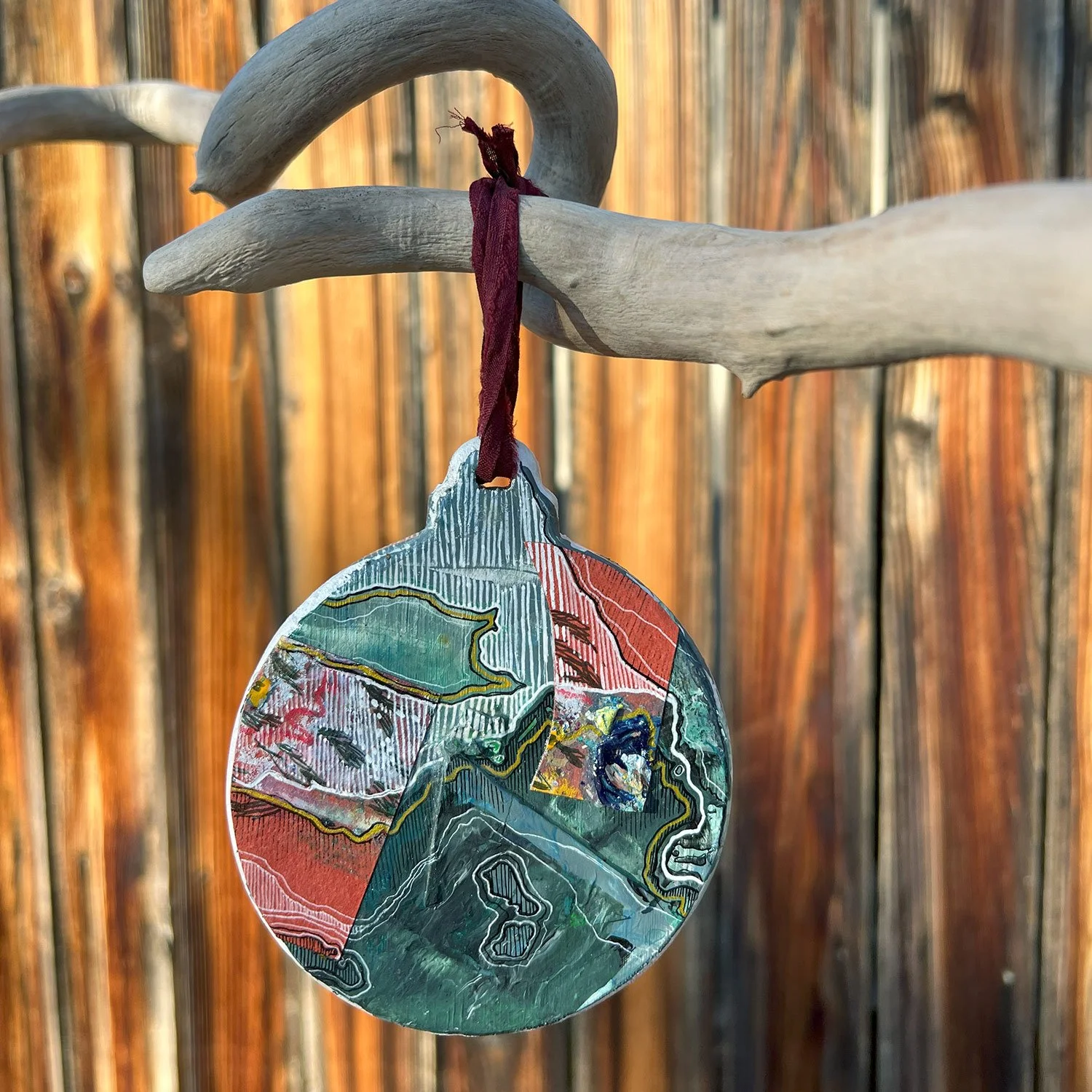 Created in the style of my Palette Cleanse Paintings, this ornament uses leftover paint from my glass palette. Colors are never consciously chosen by me, but rather by my putty knife’s swipe and the paint left behind from my canvas paintings.