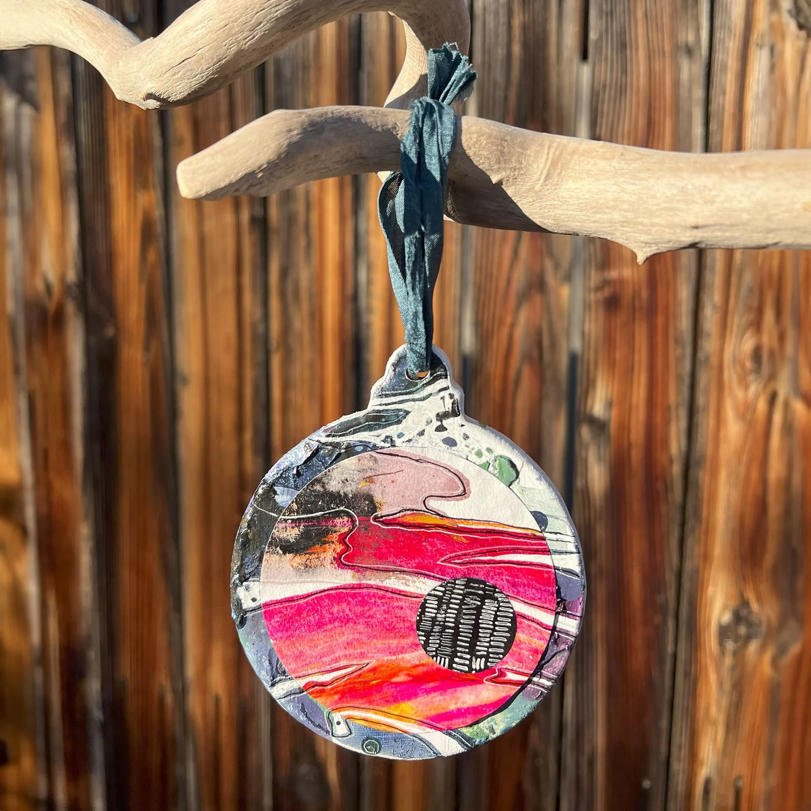 This Palette Cleanse ornament uses leftover paint from my glass palette. Colors are never consciously chosen by me, but rather by my putty knife’s swipe and the paint left behind from my canvas paintings.