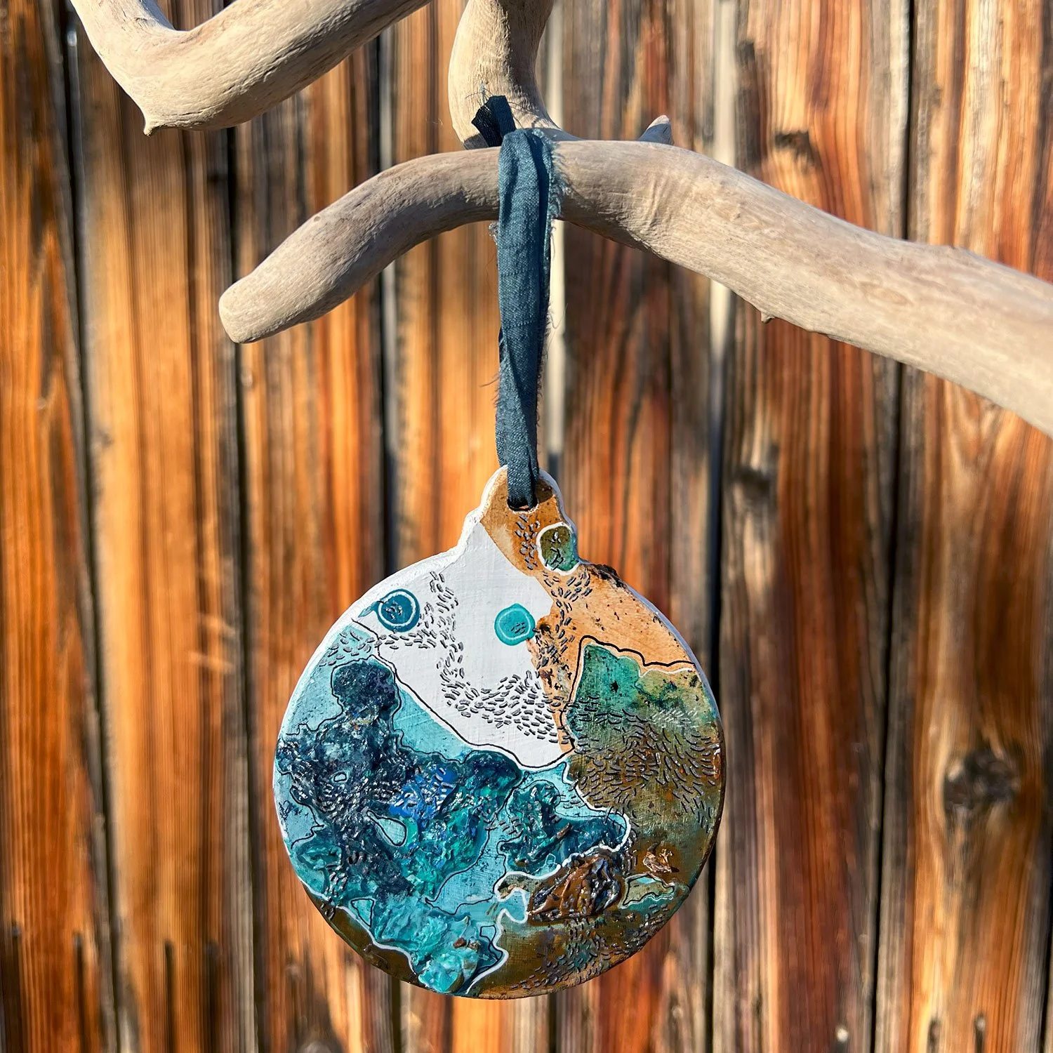 This Palette Cleanse ornament uses leftover paint from my glass palette. Colors are never consciously chosen by me, but rather by my putty knife’s swipe and the paint left behind from my canvas paintings.