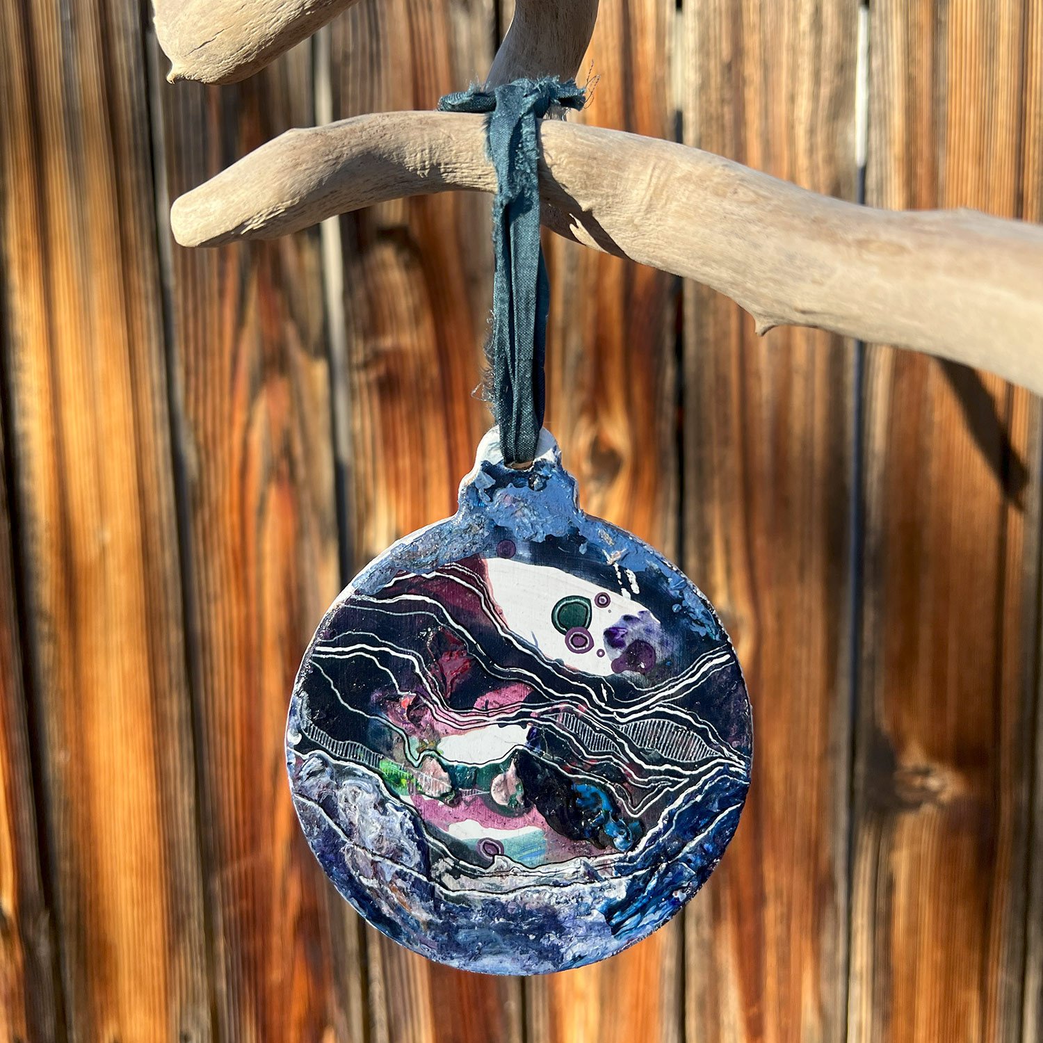 This Palette Cleanse ornament uses leftover paint from my glass palette. Colors are never consciously chosen by me, but rather by my putty knife’s swipe and the paint left behind from my canvas paintings.